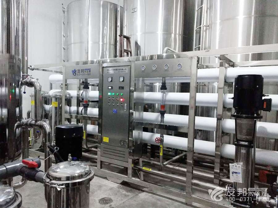 炭過濾器→軟化水器→中間水箱→低壓泵→PH值調(diào)節(jié)系統(tǒng)→高效混合器→精密過濾器→高效反滲透→中間水